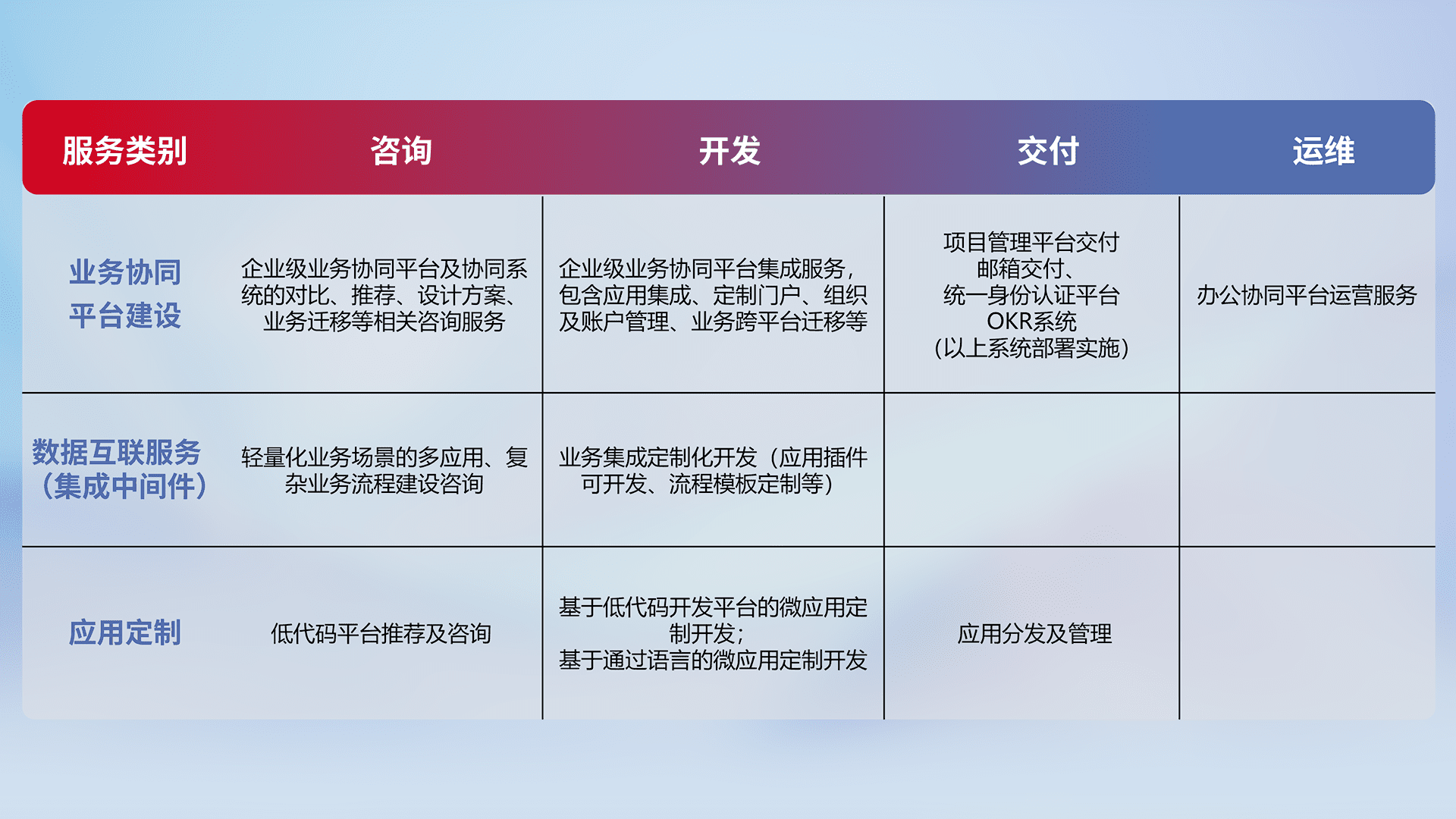 针对钉钉、、企微、、、IDaas等平台级产品提供产品的规划、、方案、、交付、、定制化开发等服务,,实现如统一协同办公、、智能客户服务、、、混合会议管理、、智能数据查询、、、、等业务场景,,,,实现数字化转型。。。。
